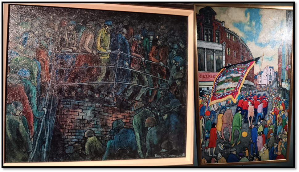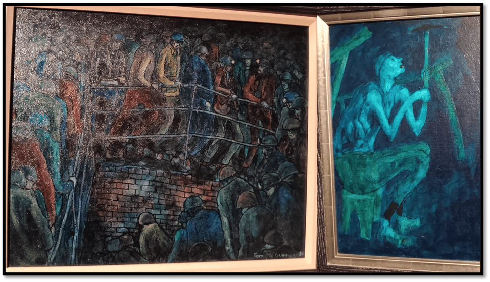 Examining this pair of paintings revealed a painter who truly explored working class lives, like his own in the mines, but as a painter as fired by innovative technique in form design and colour to create new meanings- why I think McGuinness always only sketched at work (for unlike Norman Cornish he remained in mining – even claimed to like the underground world of the mines). One could say a great deal about the painting on the left as I once said a great deal about The Hewer (right), but the variation in palette, with the maintenance of a background supernaturally dark is what strikes first.