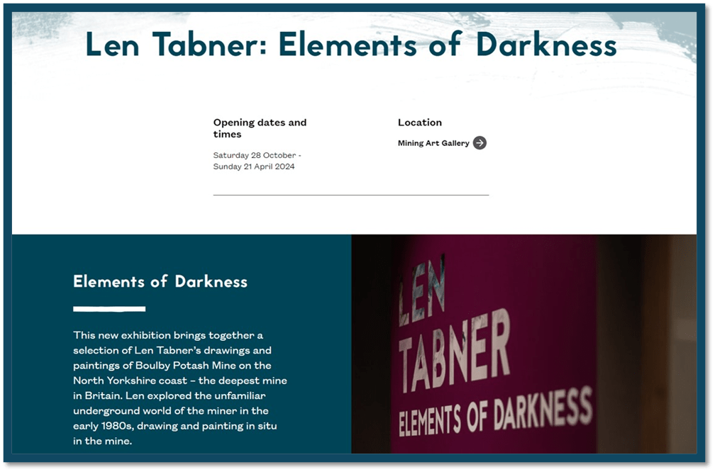 [2] Kayleigh Fraser (2023) ‘Mining Art Gallery unveils Len Tabner’s work’ in The Northern Echo (October 2023) available at: https://www.thenorthernecho.co.uk/news/23882608.mining-art-gallery-bishop-auckland-unveils-len-tabners-work/