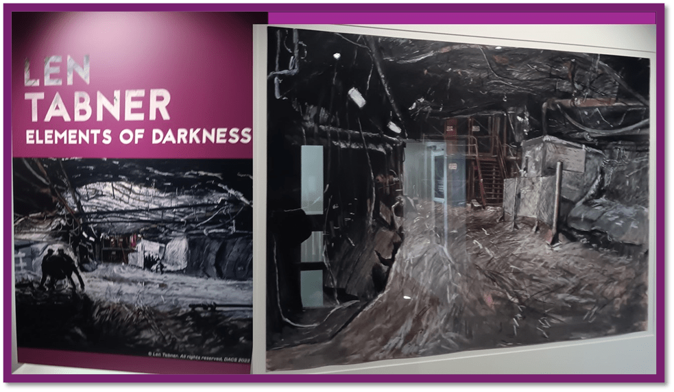 And this is reflected in both the paintings and the publicity within the gallery. A pleasant volunteer explained to us that the painting depicted on the publicity poster was the companion of a site (The Shaft Bottom) in the Boulby Potash mine which Tabner had painted before it was clear of debris and health and safety danger like hanging wires and dangerous clutter. Hence the before and after pictures as I captured them show the comparison. Of course the reflective glass is a problem on the painting, we see too much of the room, but I think the comparison of both formally shows much more than just a before and after scene illustrating an accidental moment or two in industrial and social history. I need and want to do more work on Tabner before I commit myself for here I think is an artist of extremely high calibre, whose use of multiple technical means is about visual art realising what only visual art can and photographs alone would conceal (although Tabner’s wonderful photographs also appear in this exhibition).