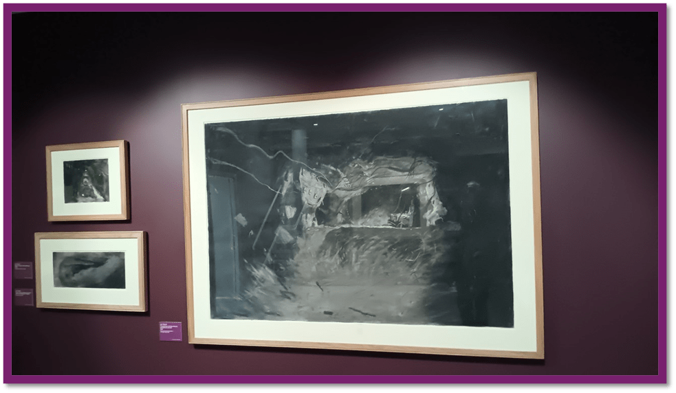 I can’t praise the curatorial aesthetics of this exhibition again. For one reason I need to go again soon is the haunting effect of the purple-painted walls, which help draw us into resistant paintings that hide, and almost smother their subjects, whether figurative or of landscapes or still life (or dynamic machinery). This does remind me somewhat Of Henry Moore’s mining drawings, to which I summarised a reaction in the blog at this link. But again I need time and study to contemplate the issues. There is so much to think about. But here’s a photograph in praise of curation:
