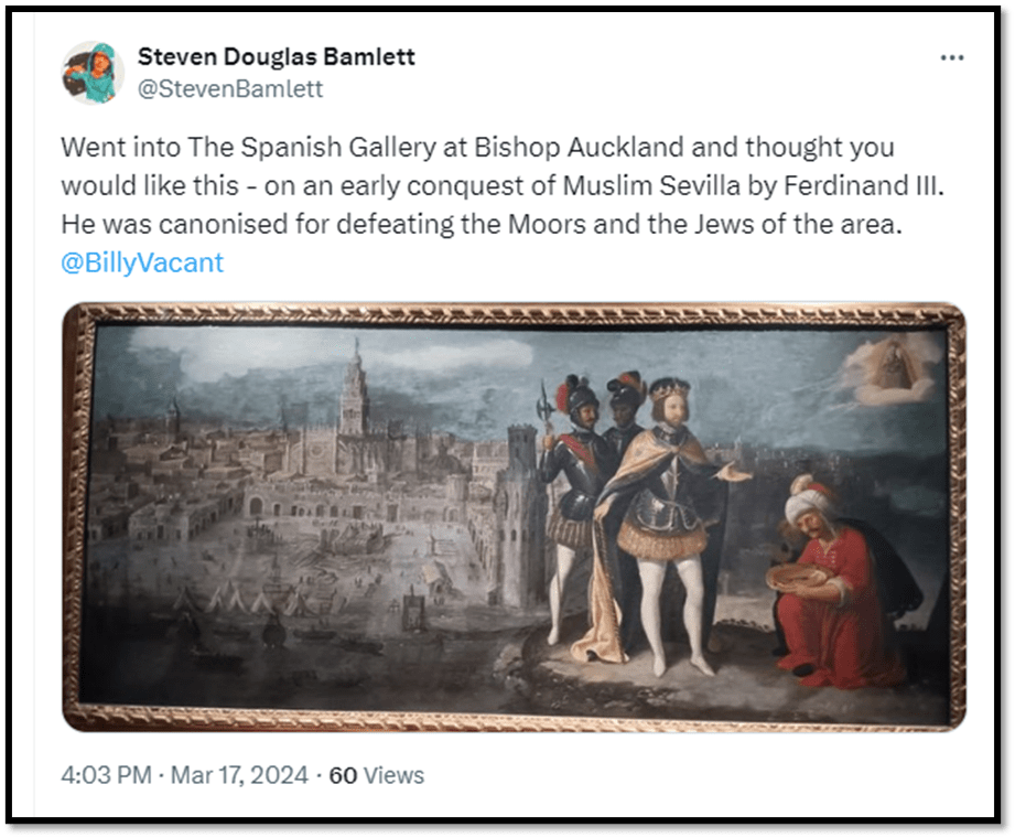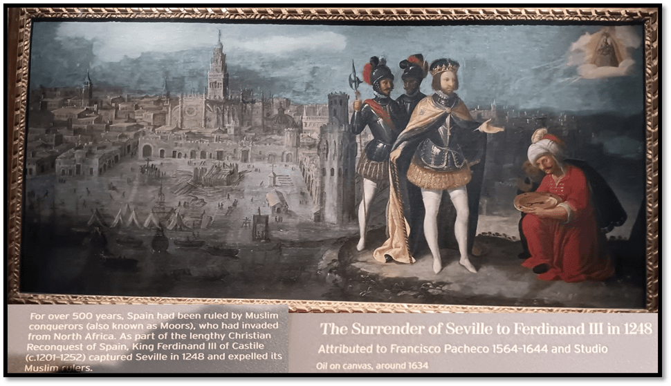 There was still time before we wanted lunch so we revisited The Spanish Gallery. One reason was a tad trivial. I was keen to photograph and tweet to a person I knew, very remotely a picture of historical Seville for he has recently moved there and seems engaged with its culture. Here it is and following it the tweet. Mission accomplished!