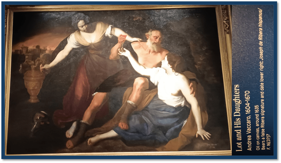 And, in the place where they once had the Dali Crucifixion, borrowed from Kelvingrove Museum in Glasgow, now is a painting that fascinates me though not perhaps for its artistic fascination. Instead it seems an important work in the deepening of our understanding of Baroque sexual-familial sensibilities, which puts a new complexion on Lot’s offering of his daughters to the rapists of Sodom and Gomorrah, who actually lusted after his male guests, the disguised angels. The plague points out that such a painting could not be produced in Bourbon Spain but it could, under the same King in the Bourbon Kingdom of the Two Sicilies at Naples. There is such power in the foot of Lot holding down one of his daughters as he offers her blandishments whilst offered wine by his other daughter. Indeed as a study of feet alone it is a foot fetishist’s delight. But is it art? Heavens know. I can quite get my head around the attribution once to Ribera, but there you go.