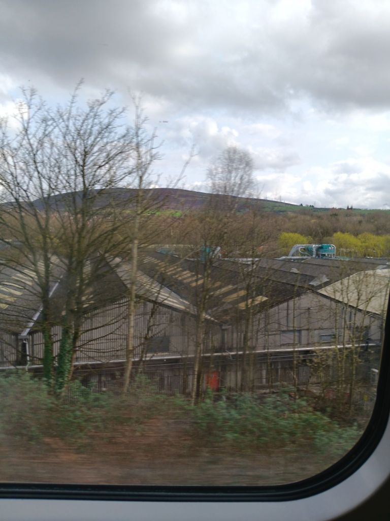 Occasionally, I looked up from my reading on the train journey when it turned from York when it became truly Trans-Pennine. I came from the hills that surrounded me on the train from Leeds to Dewsbury. It moved me to see the roads I travelled with my Mum and Dad through deep-cutting valleys, with a green that I should have rembered less sadly but that made sense in Icke’s Player Kings when I discovered it stole from Henry V the scene where Mistress Quicklyreports that Falstaff died as he ‘babbled o’ green fields’.I didn’t photograph the fields till over the Pebnines, pulling into the now idle stacks of warehouses at Stalybridge, where the hill.land was flattening down a little.