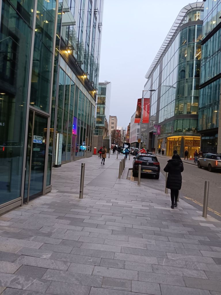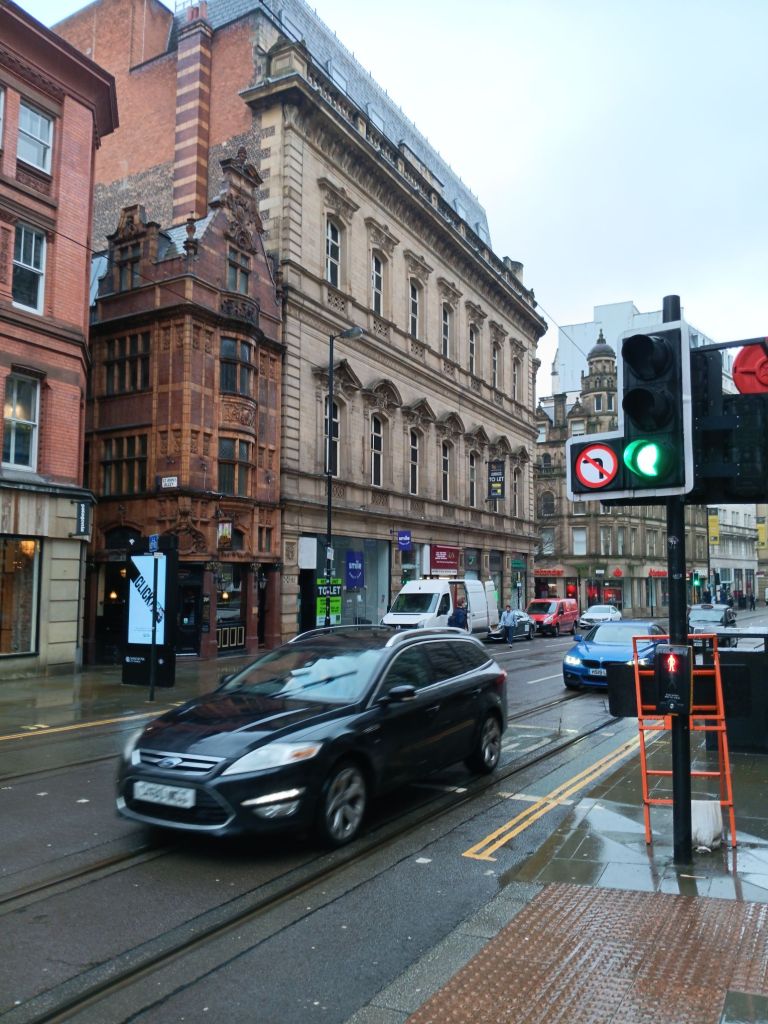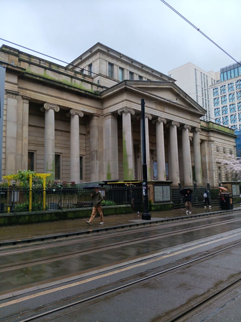 At least I thought only I could change the route back, but I didn’t count on fairly heavy rain and the need to buy an umbrella, at the nearest Primark, chosen for cheapness, I could find. From there, though, I found that Mosley Street intersects with Princess Streeat the Art Gallery overlooking Peter’s Square: how manageably small the city was becoming in my head, how much more was I coping and forgetting.