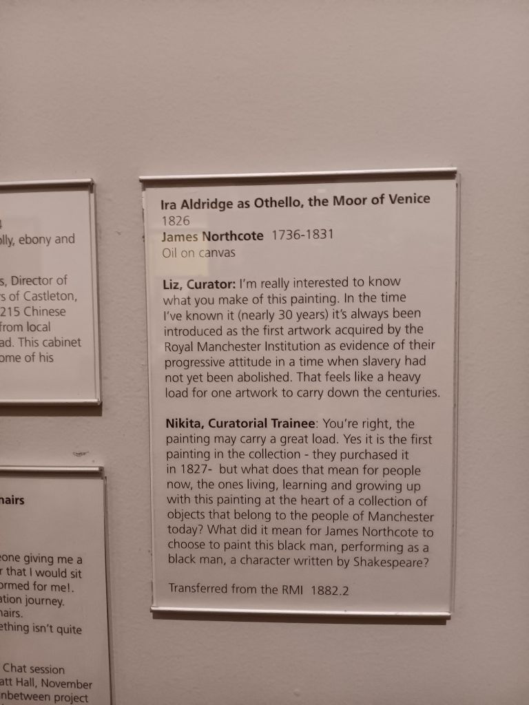 So wily is colonialism that the curators are brilliant in their discussion of the nuance of a painting meant to bruit Brotish free-trade resistance to slavery but choosing an ideal image of a Black man acting a fairly racist stereotype in a play by the Great White Bard. The definition of racism in modern Manchester might lie in that delightfully Frank discussion between young curators.