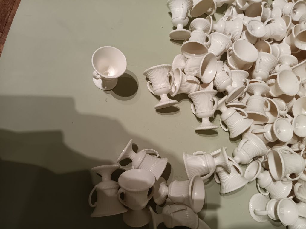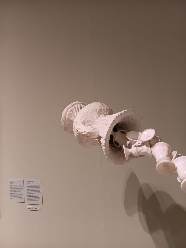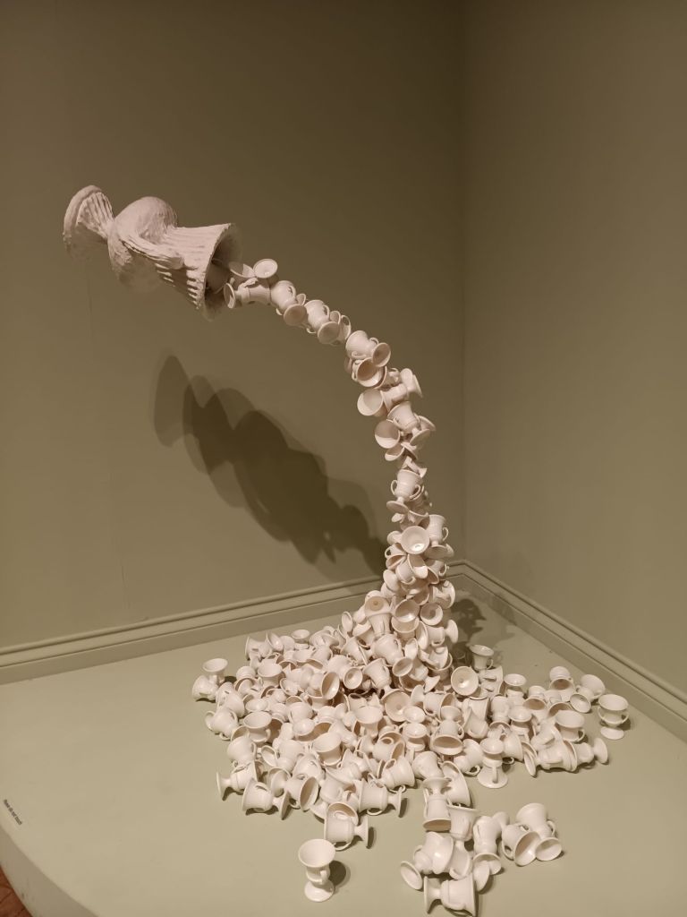 As those few rooms come to an end, I delight in two pieces, which take common objects in their time and make them ironic and beautiful, andvnot just conceptual in their effect. Greek vases became a modern throw-away commodity in 1985, when this puece by Edward Allington was made, if reproduced in plastic units. Together, they can make an ugly idea of the spillage of plastic waste beautiful. They do that not because each badly copies the idea of a Grecian Urn so bruited by Keats, but because as an assemblage, they show the beauty of the dynanic flow of pieces and the pattern of ordered and the random their spillage makes.