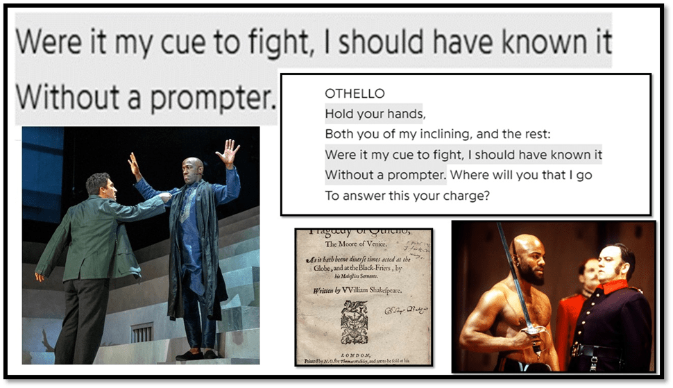 Othello is at his coolest in Act 1, Scene III (as in my collage below). There is no sickly thought here; just belief in patient waiting on a process you believe in, that will be clarified without the heat of action intervening, until that is it touches on your most possessive of feelings – you beloved wife whose actions and credibility you doubt. Othello’s coolness, however, lies in his belief in the justice of the state. And how wrong he is, even then! Nevertheless there you see it. Self-expression and action are conveyed by the use of layered metaphor that invokes the theatre in which alone the ‘action’ occurs – or is feigned.