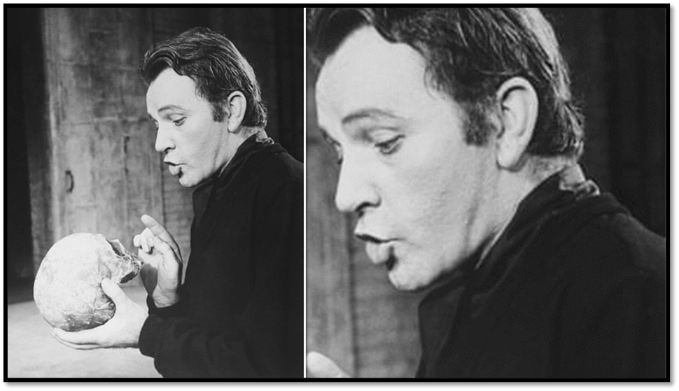 There was a puzzle I had reading the script of Jack Thorne’s play, about the intentions of his last stage direction: ‘BURTON … steps forward / He becomes a Prince. / He takes a deep breath. / Curtain‘.[2] Flynn did this brilliantly, though he took a step back and gazed at the skull of Yorick ‘prop’ as Burton himself is seen doing in famous publicity shots.