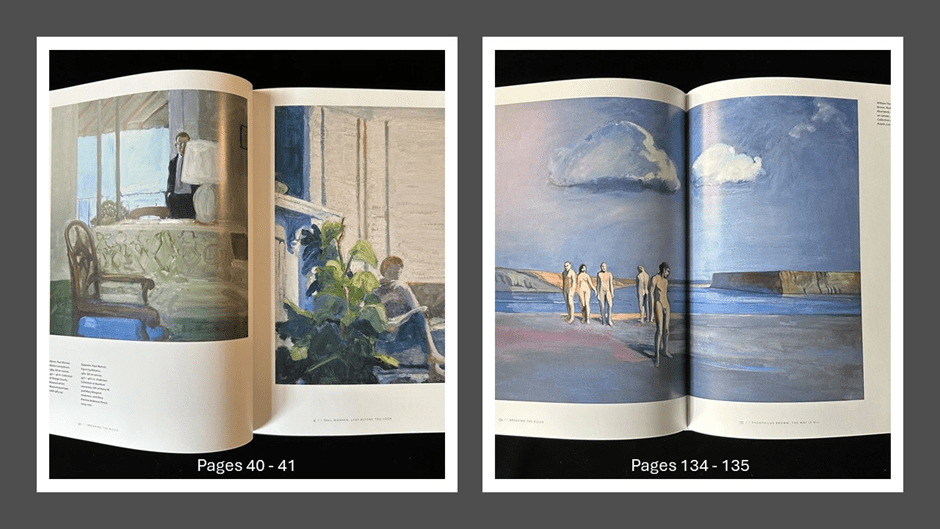 Let us not forget that this blog owes everything to the catalogue of an exhibition that I will never see in the flesh. However, it is a catalogue that might also be called a Duogram (if such a genre – or word – exists and I think it does not) as a version of the artistic monogram- a consideration of ONE artist – for this book, after a stunning introductory rationale by curator Scott A,. Shields and personal recollections of the couple as artists and friends by Matt Ganzalez, is, in effect, then divided into a monogram section for each artist – each including the moment where both men met each other (Wonner thought Brown a ‘snob’ and resisted him for some time) and their union as living partners if not as consistently sole sexual partners. Before I wander off into my argument, it needs to be said that this is a magnificent book, beautifully and comprehensively illustrated, though everyone may find a personal favourite painting omitted. You can see this by a taste of two folds from the book, the first with two pictures by Wonner, the second one of Brown’s that crosses the centrefold. Strangely enough, the pictures show contrasting themes in queer life that are actually explored by both artists, each with their own very distinct emphasis, style, and mode of design.