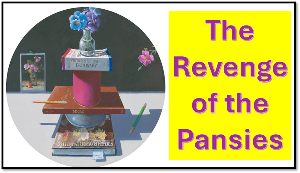 The play with almost surreal patterns of tonal variation, sometimes passing itself as the cast of light and shade or foreground and background, extends to the hyper-precision of the pencils laid at a slant or across the perspectival field with shadows in the case of the one on the left-hand side that makes us query the placing of the unnaturally static lighting implied – like that of theatre. If pansies are at the ‘top of the pile’, secondary to no-one in France, even Degas placed above the mere genre of French still-lifes. All the pansies need is a good well-thumbed French-English dictionary.