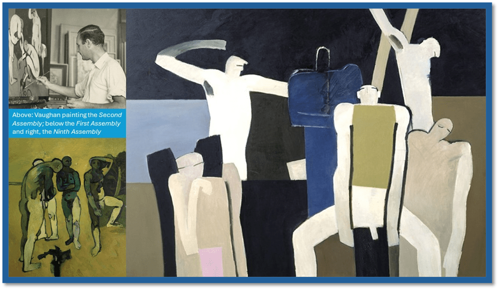 For artists this caused interesting approaches to the representation of figures in representation of groupings of same-sex figures. It is a problem that Keith Vaughan encountered in his experience of non-armed conscription (he was a conscientious objector) and in choosing to paint in such company using men as his sole models in the Second World War. It launched him on a career where the painting of all male groups became for him a distinct genre, wherein groupings of naked men stand together only partly and formally related to each other and sometimes reduced to abstract patterns, when they interact as shapes or in ritual action the relationships are queered from recognisable norm. He called them his Assembly Paintings, see examples below.