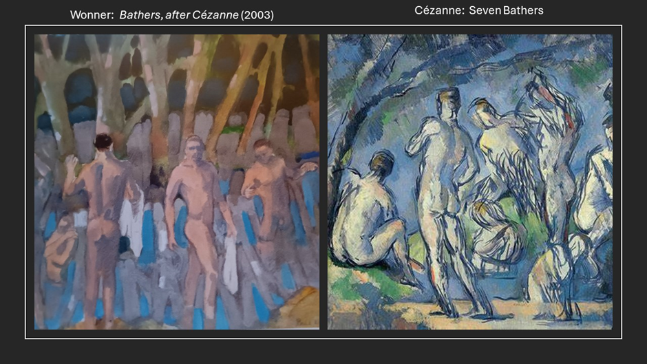 One could say the same of Wonner’s impressive attempt to honour Cézanne, for he takes the repressed homoeroticism of the originals and returns them to us with greater obviousness of sexual and queer reference. There are issues in the master regarding the representation of the homosocial group in its flesh. Even now I giggle at attempts to render these pictures by renowned art historians as a reflection of the artist’s belief in the health and hygiene properties of nude bathing. Such ideas sustain advertisements not art. When I saw a retrospective of the great artist I thought this though about Cezanne’s male nudes (see my full blog at this link):