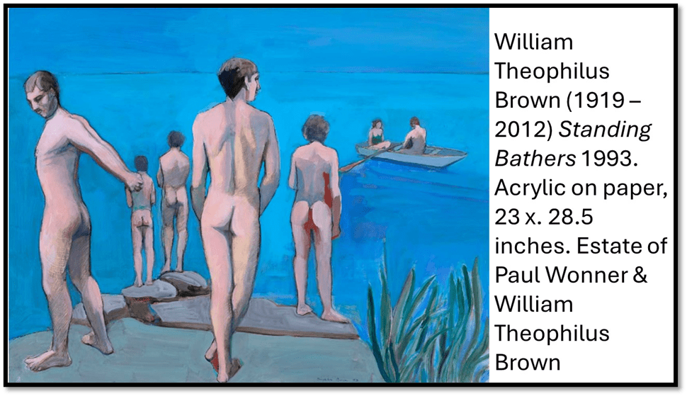 The same influence plays on Theophilus Brown too, though his bathers seem more remote and the figures tend more to the symbolic than sharing the story of how in practice men meet together. Sometimes the symbolism what Caroline Jones and others identified as quoted before above, as “disquietingly erotic” and with a “voyeuristic quality”.[13]