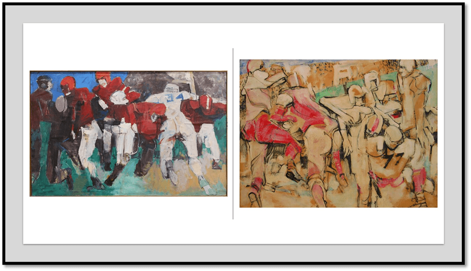 As he moved to the depiction of men in isolation, even when in groups, his view of the ‘action’ pertinent for paint to capture was internal action in the man not between men. The critic Gerard Norland said that starting from The Referee (1956 see below) the interest is in stopping physical action on the field (as the referee does) and internalising it so figures are “ psychologically charged with an ambiguous and elusive significance”.[16]