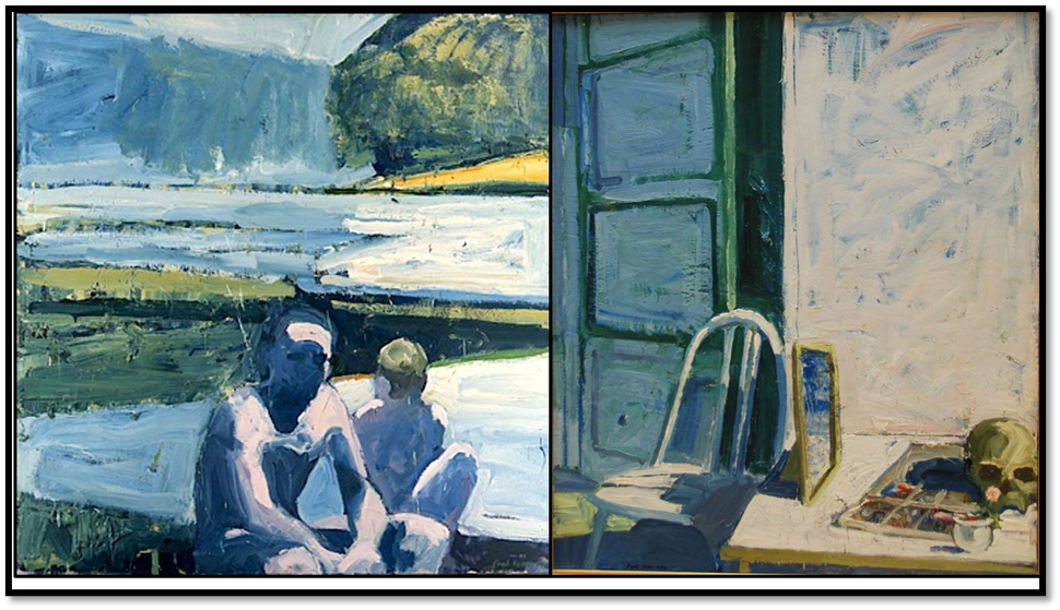 Whether this was because of what he learned from the more stoic Paul Wonner I do not know. Wonner loved drawing men together in paint, though often in couples, but they are separated from each other by psychological distance, with backs turned to each other sometimes symbolically. Likewise, he loved empty scenes of isolation where a chair stood for the absent figure. The River Bathers (1961) is beautiful and integrates figures in nature, but it also fissures figures from each other. Shadow exaggerates, individuates, and distances the figures, though there is an attempt of the pigments representing body to touch, The flow of visible paint forms enclosed daubs, wide and boundaried. It is beautiful and reflective, but it is a sad pastoral, not a joyous one. And if Death and distance can say ‘Et in Arcadia Ego’ it is not surprising that an empty chair (anyone reminded of Fritz Perls here) has a skull next to it holding down a daily newspaper in Mirror, Skull, and Chair (1960-62). And how opaque that mirror is with interaction of blue and white wide flows of disturbed paint.