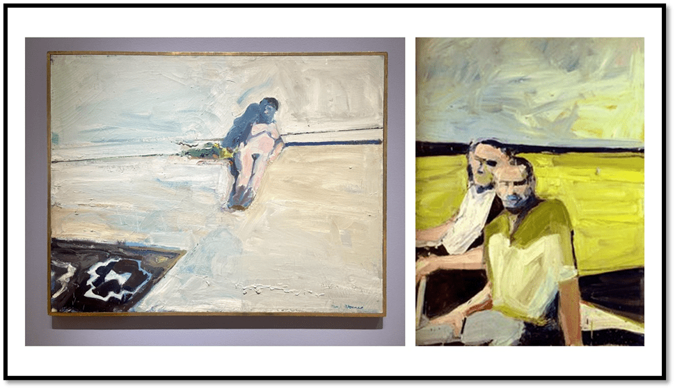 The Wonner pictures (Malibu Living Room (1964) and Figure by Window (1962) respectively) emphasis themes of reflective isolation that both painters dealt with but that Wonner made his own by the creation of a scene that looks like a blurred reflection in a mirror. In each case the interior has an engaged and contemplative subjective interiority: details of faces get obscured by objects and lighting (shade in the first, glare penetrating a window in the second), whilst thought processes are conveyed by the unconsciousness of a viewing gaze, gesture, posture. There is engagement of the figured in something or nothing, in a matter or task that may not matter – in both artists a neglected ‘open book’ may take this role but here it is an abstracted diverted gaze or a newspaper idly gazed upon, though not held. In Wonner, the paint marks themselves create both detail and obscurity – as a pattern unseeable in a tablecloth or the positioning and dynamic of the hands in the sitting figure, whose sex/gender seems merely accidental.