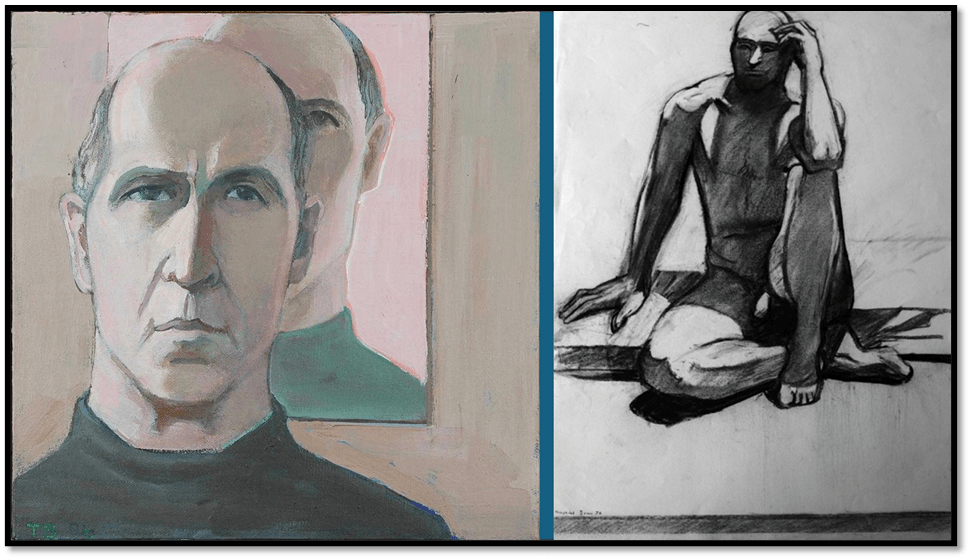 In Brown there is a very conscious percipience. Only he could do a double self portrait where the self is angled differently but is reduced to the gaze of very intelligent eyes. Even his nudes do that. The eyes vie with a defiance that the gaze of the viewer be not drawn to the penis of the nude – made luminous as it is here with what isn’t an accident of light. For Brown the puzzle of sexual physical attraction had to be solved and honestly. The self-portrait works because at first we mistake the portrait behind the figure as a mirror – but some mirror that does not capture the viewer but the artist gazing out again.