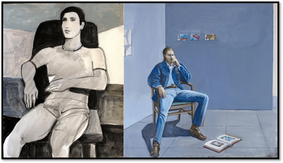 On the right is Jim Christansen (1970). Stuffed with motifs like the small miniature scenes (his own fantasy paintings) and an open art book, these openings in fact only make more prominent the very masculine opening and spreading of the legs, and the forward motion of one foot. The married artist was not gay as I believe but was notorious for being banned as a children’s illustrator because of what people saw as the sexual context of his fabulous pictures. Are both men through reduced by a phallic gaze. My own feeling is that there is no reduction here. The stylised bulge is seen as part of the saccading of the eye back and forth, into the illusory depth of the portrait and out again. It is this which emphasises the peripheries and the multiple foci, though still largely physical than imaginative in the young man – the muscled arms.