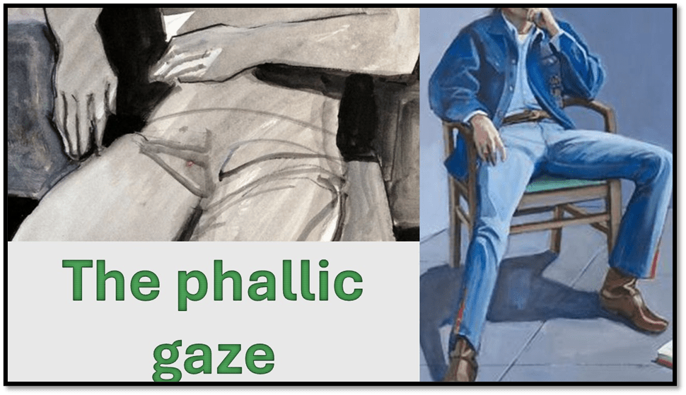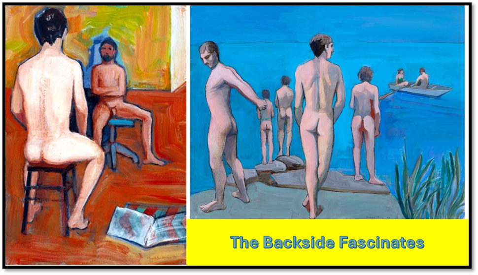 I think the point is the honesty that refuses to not admit that that the phallus is an object of desire for some. The prominence of it in our desire depends on the training of the eye to use the fact that it looks everywhere but not neglect this fetishisations of body parts for they integral to desire in their variations. Likewise the interest in the backside view of men in both painters. Below, on the left Brown makes anus and penis meet as alternate foci, though when we withdraw we notice this is an artist and model motif, of which both artists were fond as a motif from classic art made his own by Picasso but too often as a generalisation for universal heterosexuality. I have already spoken of how the back views of the standing bathers stills things, but one point of the painting is how the back side view of the whole body view is reduced to the backside (the anus) in focal vision and patterning thereof. There is a flow of the eye, in a wave in that panting ended in that troubled red crack of the anus.