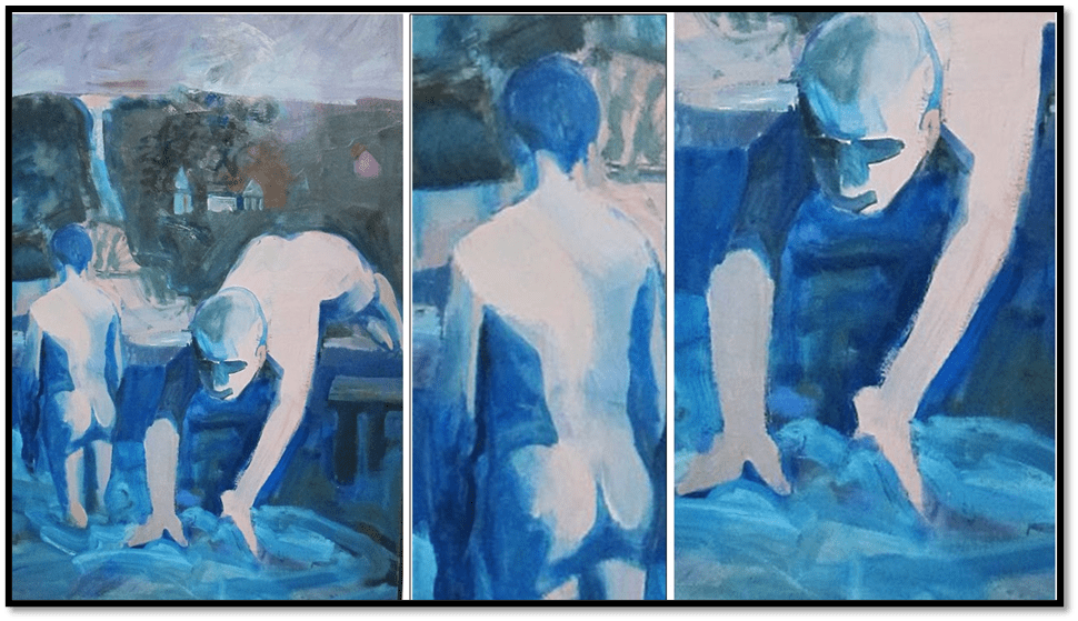 But in the collage below, see how Wonner’s male bathers are even more clearly posed so that we see all around the male body. The trees fuse via the paint in a manner that blurs the boundaries of objects and things in the interflow between branches, arms and different kinds of trunk. The men are doubled in their reflection in water. A contrapposto figure in the centre is flanked by frank vision of anus and penis, although I doubt whether these bodies better Cezanne’s sinuously beautiful nudes.
