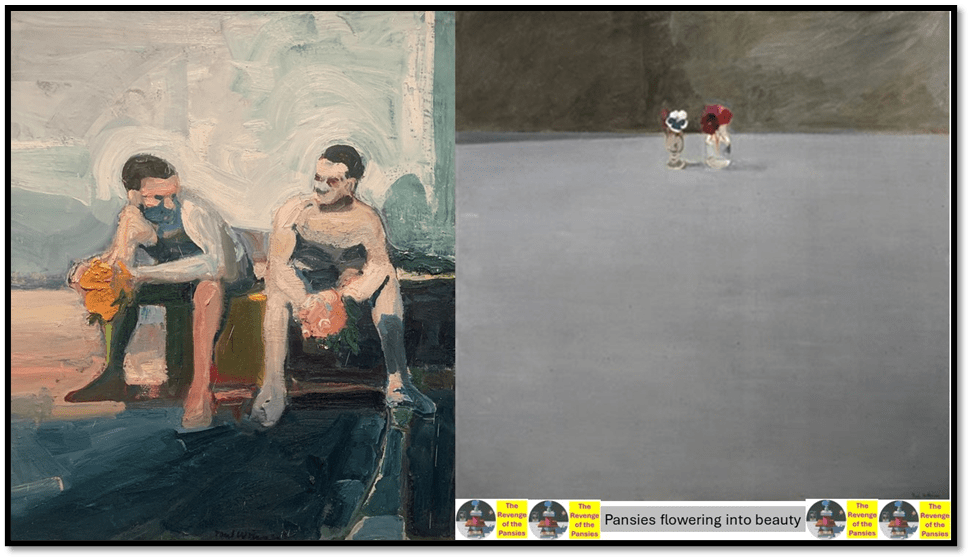 Hence I have labelled the collage in which I feature that painting’s reproduction Revenge of The Pansies. Of course, we have to have fun and the truth is more nuanced – I will eventually argue that, far from becoming absorbed into the competitiveness of the institutional art-world, rigorously heteronormative in its public face especially amongst Abstract Expressionists, like Jackson Pollock, it preferred a model of retreat and collaboration and a painting that allowed worldly claims and titles to go elsewhere, whilst their painting followed innovative tracks to high standards that made heteronormativity look like a rigidity of mannerism as behaviour or description of life or art.