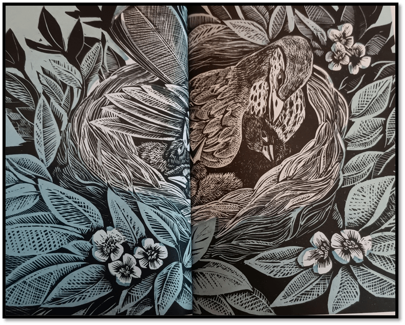 Some of the woodcuts illustrations too seem to celebrate a rather oldie-worldie sentimental view of loving reproduction that valorise family in a false manner, as in this of mother duck and ducklings nesting over blossom.