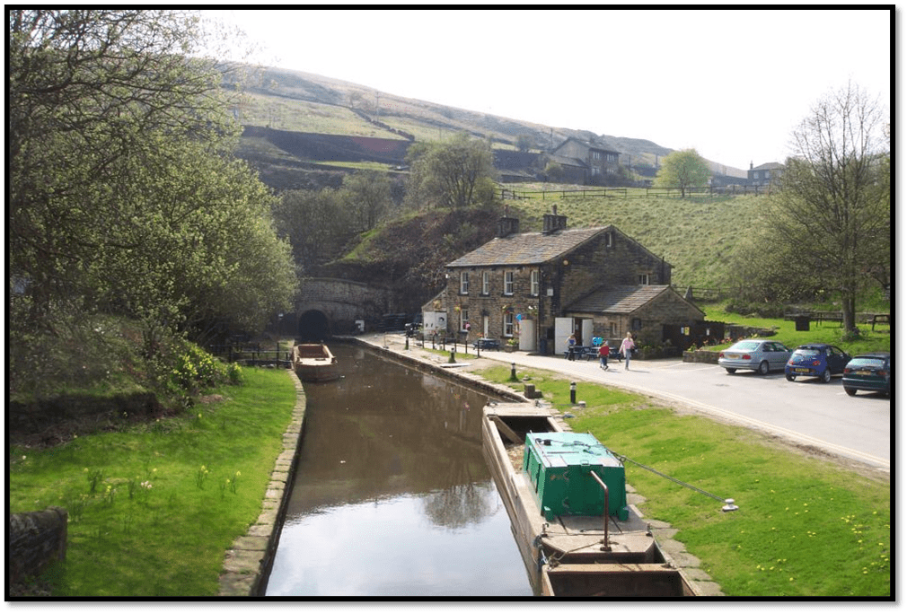 The eastern end of the Standege Canal Tunnel and Tunnel End Cottages, Marsden, West Yorkshire. For more information see the Wikipedia article By Chris Wood, CC BY-SA 4.0, https://commons.wikimedia.org/w/index.php?curid=1539388
