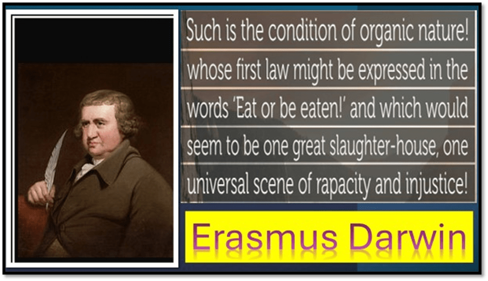 The Duke still exists on Duke Street, as does Davy Byrne’s eatery, but I do not know if The Duke in which we know Joyce dined regularly was also the ‘Burton restaurant’ referred to Episode 8 of James Joyce’s Ulysses. That episode is usually known as the Laestrygonians, since it paralleled the episode in Homer’s The Odyssey, where Ulysses is beset by cannibal giants of that name who murder many in his crew. It is a place where if you aren’t eating, you may get eaten. That analogy is what fires the description of my favourite restaurant in literature, with its version of a statement of Erasmus Darwin, the pan-intellectually curious father of the more famous Charles Darwin, of 1800.