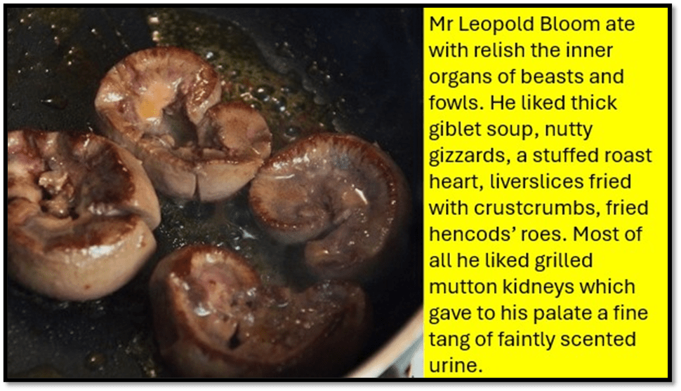 Eating is not necessarily a selfish thing, but let’s continue in the light of that quotations emphasis on selfish competition as if it was and address communal eating later. Certainly eating is sensed first as an experience of individual intake via the embodied senses and mechanisms involved in both tasting and eating (such as the organs involved in humans processing food – plant or animal – from the lips, mouths, tongues, teeth to the .visceral internal organs of food processing during consumption down to excretion of waste consumption also involves. Kidneys are important organs in the book, where the urine they expel becomes an excitement in their consumption. In fact, the ‘good breakfast’ Bloom thinks about above would have included lambs’ kidneys had he not burned them and had to throw them to the cat (in Episode 4):