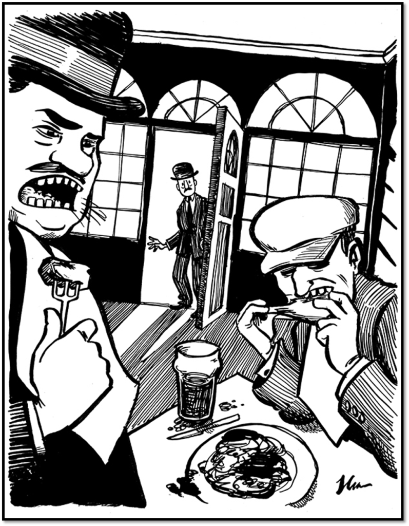 After all, in restaurants there is, underneath the civilized diner, in all of us perhaps that ‘fellow ramming a knifeful of cabbage down as if his life depended on it’. Okay, the higher the class distinctions, embodied in the actions of social etiquette, the more we target such appearances in ourselves and modify them. We aim less to ‘ram’ food in, as regulate it and our appetite with a more ritual use of feeding implements and ‘manners’. The less also under those latter conditions, will we take our meat, and: ‘Tear it limb from limb. Second nature to him’.