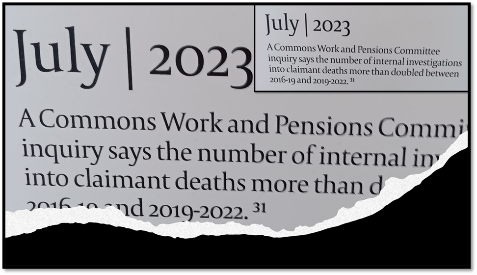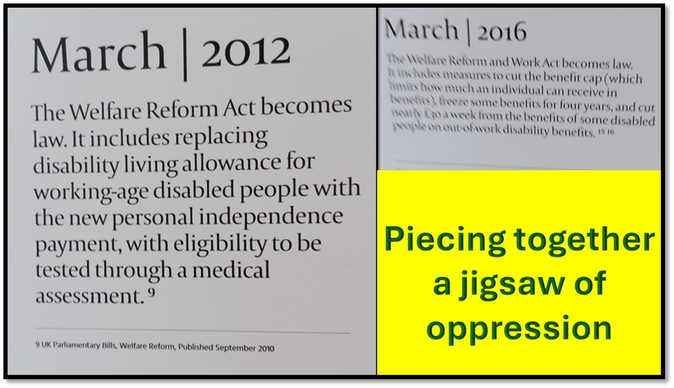 For the very systems that claim to induce responsibility for self in what are often called service users do the opposite. In my experience, they have long done so, but as this exhibition shows too, we have passed through a dark period. This is revealed in the pieces of audio from parliament that pepper and insult the figures and you from parliament: Ian Duncan Smith, Therese Coffey, and Boris Johnson with their empty moralities and even emptier sympathies for ‘tragic cases’. They were, after all, all foreseeable these deaths; caused by the insistence on not seeing the person, only the ‘problem’ they posed to a system inclined to act as a miser of the national conscience, retributive vengeance and a whole load of contradictory other things. There is a timeline telling this story in the foyer to the exhibition.