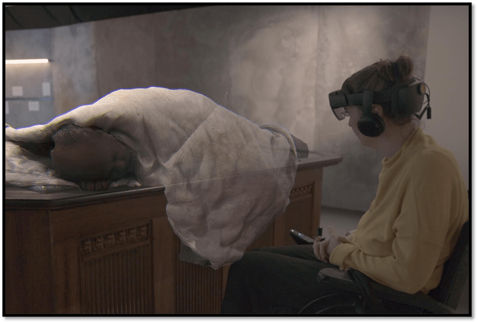 Do we identify with the dead, we who are living, in these stories? Do we identify with the disadvantaged, marginalised, and disabled, we the entitled or feeling as such? Certainly, some of the figures, like the woman below, are identifiable as like ourselves or our relatives. What matters is that we identify with the one plaque that appears in the hologram room (not as a hologram and seen in the picture below).
