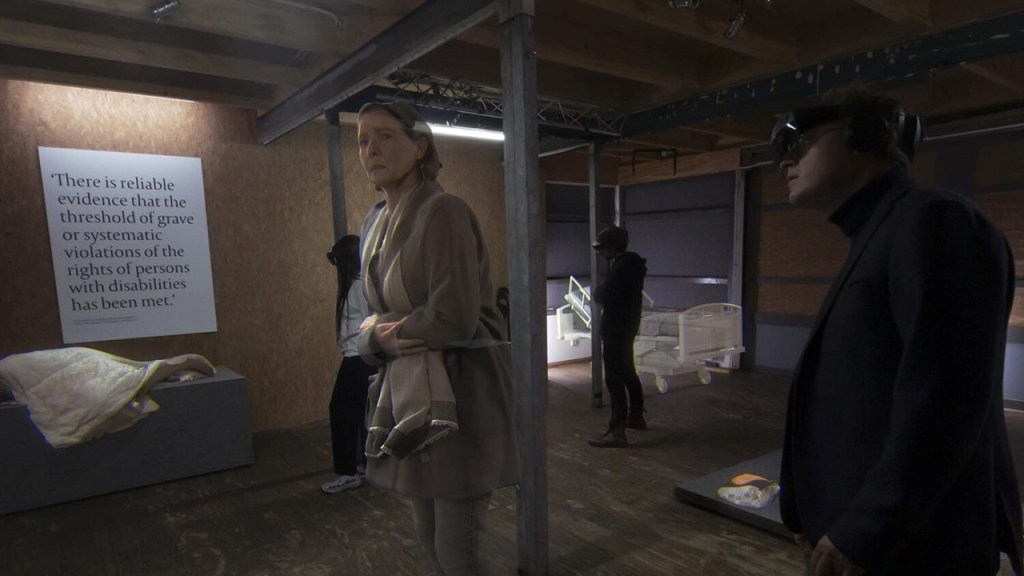 Yesterday I visited with my husband Geoff, the Live Theatre at Newcastle, to see a show that has received multiple awards for its contribution to the art and functionality of different modes of social art – documentary, immersive theatre and digitally innovative theatre. Audiences don digital headsets and then enter a room of unadorned stands – these room spaces vary according to the setting, as my internet sourced pictures show. They are deceptive those pictures, by the way, for only wearing the headset do you see the static three-dimensional holograms on the different stands (some holograms merely stand against a wall or lie on the floor, one older male hologram lying in the filth he died in, on the street still carrying the bag of goods given to him by Lidl in their bag, with a loyal dog by his side). Without the headsets, you can’t see these figures, though. However, because the sets are bifocal, you do see the real rooms that are their archival place of the figures’ virtual being for the moment. You do not hear their stories without the headset either; it is told not by them (for they are dead and that respect due is paid to them, not to appropriate their personal stories) but by surviving relatives.