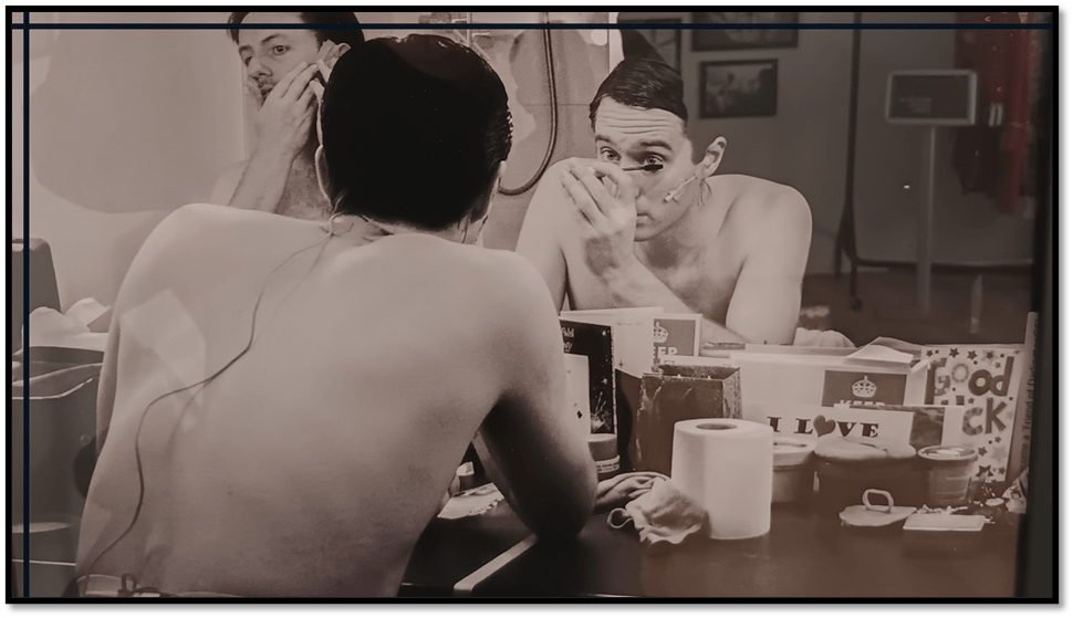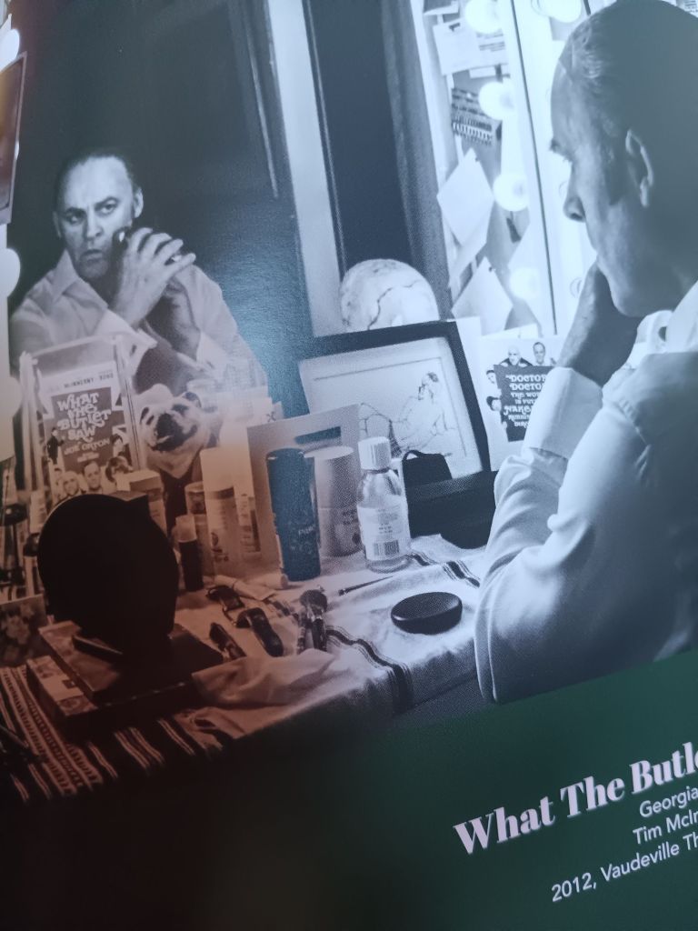 Nothing in these photographs show Tim McInnery and Jason Thorpe respectively attempting to feminise their appearance for their stage roles – masculine roles as they are- but even when Tim holds an electric razor for shaving of a type usually used only by men, the appurtenances of conscious makeup: a large lit mirror, mechanisms of make- up application, manual.manipulation of face confuse the sex/ gender roles portrayed, at least in this backstage liminal space.