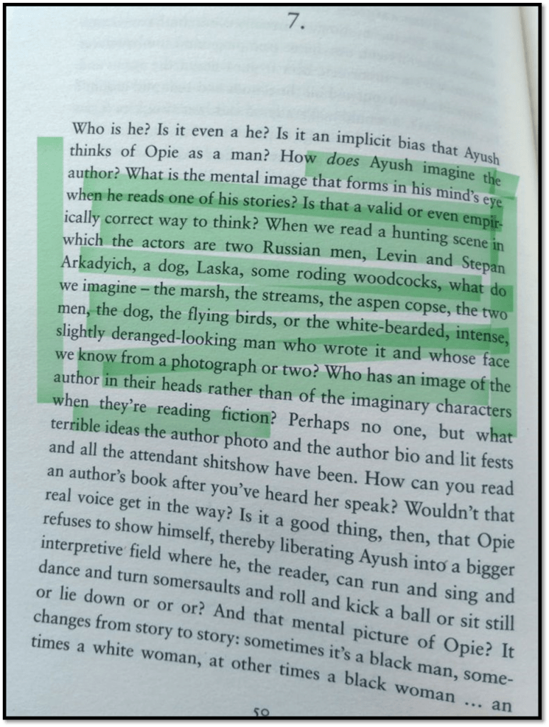 There is a payoff of vanity, in which I have no pride, from sharing a moment like this with a novelist, until, that is, in the very next chapter and page of his novel he undercuts any reader already in the know, that is, by using as an example of how we imagine an author behind their text (for him this is M.N. Opie, using a piece of Anna Karenina as a way into the mind of Tolstoy. It serves in the novel too to make us conscious of the continual de-centering of Ayush’s point of view in the story and of the author, Mukerjhee, despite the constant use of avatars (once Booker long-listed and rather frustrated authors in this and the second story) occur, particularly given that the victim of the story will turn out precisely to be Spencer.