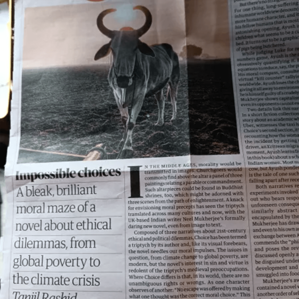 In the middle ages, morality would be transmitted in images. Churchgoers would commonly find above the altar a panel of three paintings relating a biblical parable or commandment. Such altarpieces could be found in Buddhist shrines, too, which might be adorned with three scenes from the path of enlightenment. … / Choice has been termed a triptych by its author and, like its visual forebears, the novel needles our moral impulses. The issues in question, from climate change to global poverty, are modern, but the novel’s interest in sin and virtue is redolent of the triptych’s medieval preoccupations. /…/ …At home with neoliberal Luke and at the offices of his multinational, Ayush encounters an outlook defined by “the centrality of money, its foundationalness”, which crushes the humane values he reveres as a scholar and publisher. Ayush’s interior monologue is compelling, especially the satirical vignettes from a publishing industry mired in “white mediocrity”./ But there’s no straightforward side-taking in Choice. ...[3]