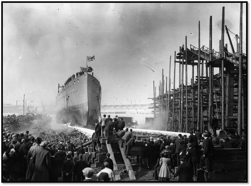 Yet does the poem really need to work hard to colour the effect it wants with technical surprises and unexpected choices of colour metaphor. ‘Gunmetal’ is precise in the context of the production of armaments, and the reflection of metal on metal prepares us for the couplet that follows that moves from looking at riverscape to imagining the launch of ships that once went on in its dockyards, linking labour to the machinery of war and transportation. In fact I think the words are chosen well (possibly the result of hard work such as Kelly requires). The rivet and nails bond forcibly together (both are implements mentioned in the first stanza) two distinct ideas, and perhaps another, for the stanza recalls the monochrome photographs known so well to the families of Glaswegian dockyard workers, of launches variously of floating gunpower or the boats that will carry Scottish emigrants to new lands (another idea that emerges through the poems handling of the docks as a ‘place of memory’) where all reflection from within the photograph outwards towards us is in variegated grey.