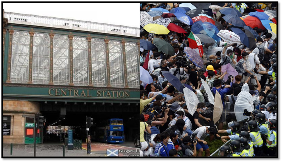 Hielanmann’s Umbrella is a real place in Glasgow (a glass fronted bridge – see below), where assembling protest marchers might meet but Kay is a poet of modern mass protest too and umbrellas are rife in modern political discourse, to indicate alliances (as in the LGBTQIA+ movement) or the coloured umbrellas used against police guns to emphasise peace against war (umbrellas not guns) in modern protest – or the wholly yellow ones used in Hong Kong. Grief as Protest is a better poem than In Memoriam for it holds private grief up against a genuine public standard of democratic protest not an illusion of public well-being that excludes the masses as in Tennyson.