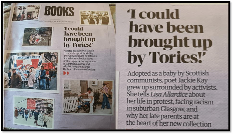 [10] Lisa Allardice (2024) ‘Interview: Poet Jackie Kay: ‘I could have been brought up by Tories!’ in The Guardian (Sat 13 Apr 2024 09.00 BST) 43ff. Available online too: https://www.theguardian.com/books/2024/apr/13/poet-jackie-kay-i-could-have-been-brought-up-by-tories