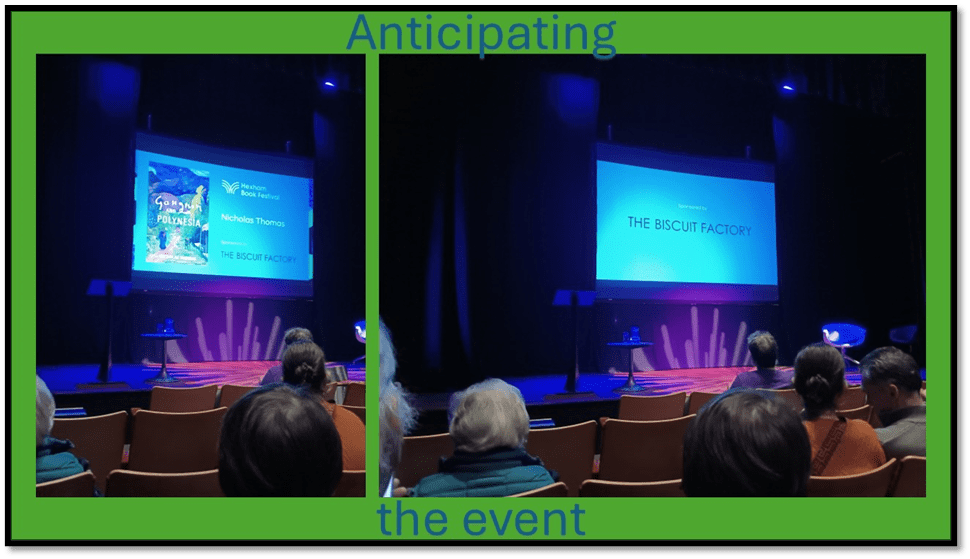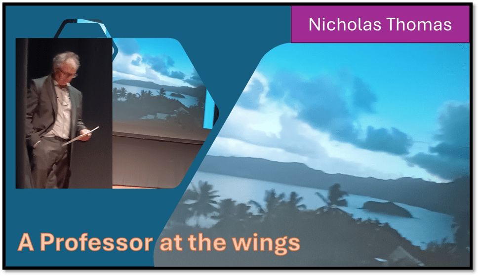 Since I see many live theatre performances I ought to start by defending the use of a ‘talk’ as a ‘live performance’. Nicholas Thomas is a Professor of Historical Anthropology at the University of Cambridge and associated with the curation of work at the Fitzwilliam Museum but, despite the almost typical professorial demeanour and look, noticeable as he waited in the visible bit of the wings of the Queen Hall stage to be introduced first and glancing over his lecture notes, this was brilliant performance indeed that diverted often and fascinatingly from both the text and examples of his brilliant book. He entered to a stage radiated by a slide, of his own photography, of a bay in Polynesia, Hexham has never looked like this on a promising-to-be-wet Sunday.