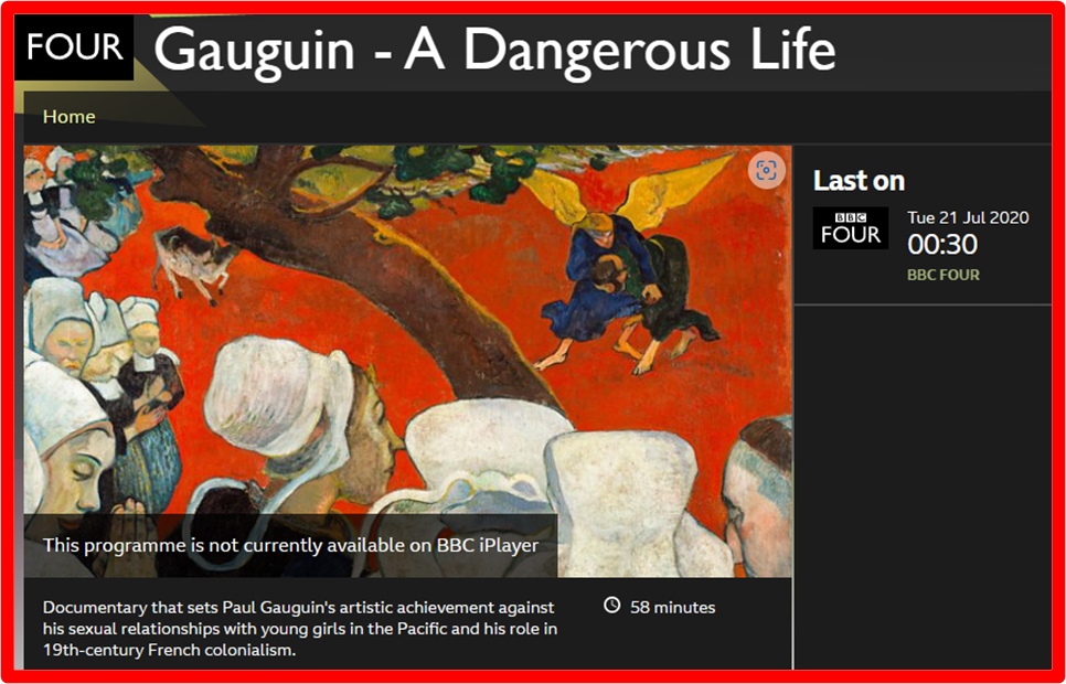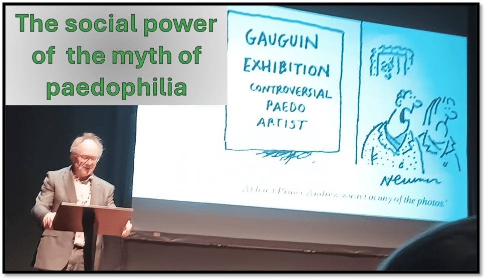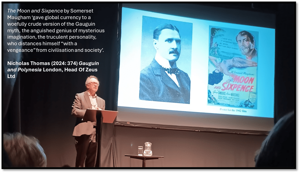 However, Thomas began his presentation by addressing the elephant in the room – the difficulty that can not but express itself when Gauguin is mentioned in literary discourse despite the view taken of his art. Thomas instanced that with the slide of a review of his book in The Guardian, a favourable one he said, that nevertheless lead with the headline: ‘YOU CANNOT ENJOY GAUGUIN’S ART WITHOUT GUILT’. He could, had he wished, used the BBC documentary on the artist that polarised Gauguin between visual genius in his art and a man of dangerous politics and sexual preference.