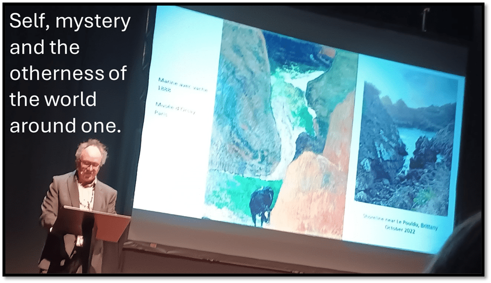 But much more was said in the talk, with new illustration thereof, of how Gauguin mediated as mysterious, in the sense of puzzling or ‘queer’, in the old (and perhaps new) sense of that last word, the relationship of self and the world. A painting not used in the book of a bay at Le Poldu, Brittany, illustrated the blend of realistic representation of the actual and the need expressed in Gauguin’s phrase ‘soyez mysterieux’. He could have added too how, by using the impossible high view-point and the threat of enclosure by the marvellous, the bold expressionistic (or Nabi – see my blog at this link) colour impositions and a cow as teetered on the edge of disaster as that in The Vision at the Sermon (1888) he threatened enclosure of his viewer in the dangerous depths under the painting’s surface.