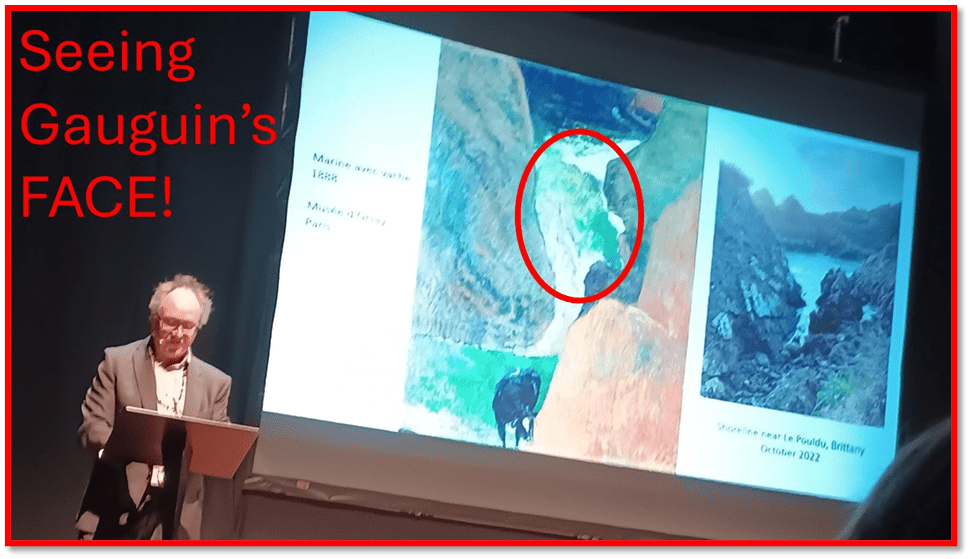 But what he did, for all the above is implied (at least if you had read the book or were avidly excitedly reading the painting at the same time), is deepen one of the throw-away remarks in the book that didn’t get illustrated there. Speaking of the painting, Red Hat, Thomas said there that its suggestion of a ‘head in profile’ in its hat brim. He continued by saying, almost as a throw away that: “Gauguin occasionally hid heads or faces in paintings …” (Nicholas Thomas (2024: 110) ‘Gauguin and Polynesia’). I had wanted an illustration there, but here one was and bolder and mird suggestive than ever. We see, he pointed out, Gaugin’s face profile in the deep enclosure of the water at Le Poldu.