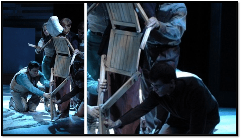 Otherwise apparently simple puppetry (by the standards of War Horse at the least) from unusual materials, such as a chair becoming a body, cabe used as in this still captured from a later production in the USA: