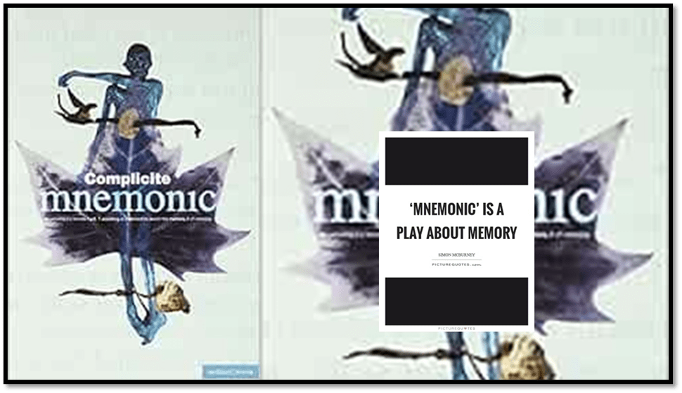 [1] From the speech of the main actor, named as ‘Simon’ in this text for Simon McBurney in the 2001 production, in Complicité (2001: 4) mnemonic London, Methuen Publishing Limited. NOTE: MY OMISSIONS IN QUOTATIONS INDICATED BY …., The text’s own use of missions is represented differently (as . . .).