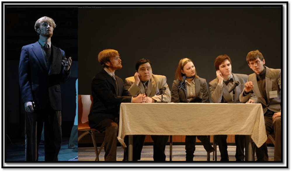 The character Spindler below intrigues, standing before a German newspaper report of the discovery of the ice-encased body. But let’s end with puppetry as in the second still on that collage. Puppetry has become more common in the theatre and used to brilliant effect. Which way will this production turn. Retain the simplicity of how forms can be changed in stagecraft (a chair into a body) or use more sophisticated methodologies. That might matter if modern audiences are to be convinced that this is about ‘memory’, as they have learned to know it.