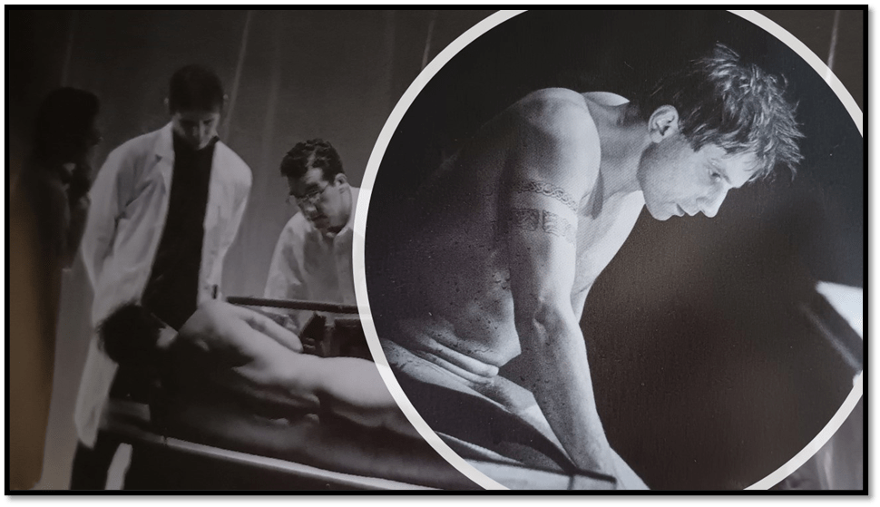 In the American production the Iceman wears boxers and I wonder how this will be handled and what it tells us about the handling of nudity in the modern theatre, supposedly much more ‘liberated’ than the 1990s in this year’s production. In the still collage below we see the iceman being dug out of the ice (‘Naked except for a strange grass-filled shoe’) and then forensically examined, having been ‘dehumanized by becoming public property, a national monument’ in Scene Fifteen. Journalists wonder why it is ‘naked’ and one whether it ‘has a dick’. Being a ‘national treasure’ two nations haggle over whose nation it belongs to – rarely done favourably with migrants but they be over 5000 years of age. Borders become important, even the ones defended bu boxer shorts.