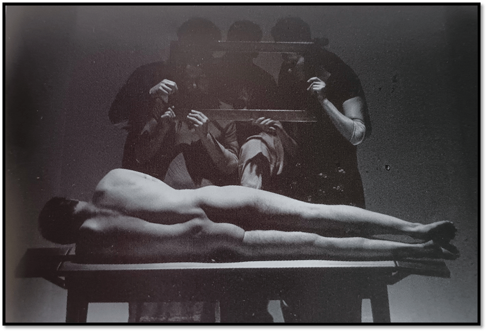In the photograph above the naked body enacting the stiffness of the Iceman is McBurney, but we know that, from the text, the critical accounts and the other photographs that he was also Virgil, the man whose wife has kleft him perhaps to seek her migrant Jewish ancestry. And we know others take on the Iceman role (things and persons).