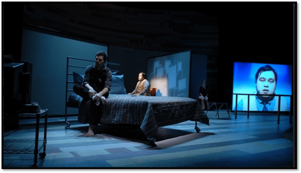 The production pulls considerable punch then in terms of the means it uses in an actor’s repertoire, although there is no guarantee that this production will go for the same approach with McBurney now as director rather than leading actor, and with a whole history of differing receptions of the play behind it. Moreover in 2001 it was in the Lyttleton. This time around it is in the Olivier, an enormous theatre space with enormous potential for mechanical and digital innovation. I suspect simplicity may be more notional than actual in this production. Some interim productions use large screens that aren’t mentioned in the text, but are obviously legitimate means of further fragmenting the style of enacted delivery of the scene’s messages. The fact that the Olivier is not a proscenium stage as such will necessarily be taken into account. The production is refusing to sell its ‘front stalls’ seats as yet and warns that once they do so, they will come with conditions to be understood by those purchasing the (how exciting). But see the large screens on this American proscenium production: