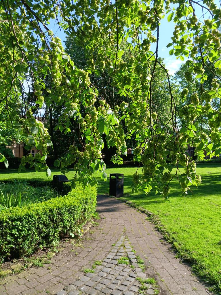 There is a lovely square of bold houses; now, it seems, the houses are perhaps offices, apartments, or meant to be one or the other. As houses, they date from an earlier time of bourgeois confidence in the ‘capital cities’ of counties. But my point is that this is a square that you can circle inside. Squaring the circle is a rare enough achievement, and even here is probably impossible to any degree of accuracy. But the flowers and trees make it beautiful in May, even the rhododendrons, which we are now trained to see as a vegetative blight, except in May where the beauty of their flowers fights back.